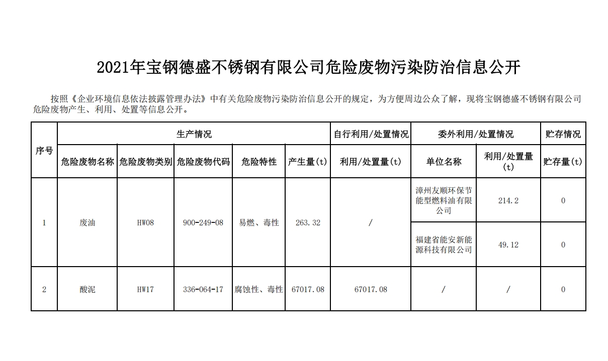2021年宝钢德盛不锈钢有限公司危险废物污染防治信息公开