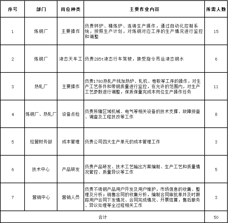 本次拟对外招聘共有50个岗位,计划招聘人数99人。招聘岗位具体信息以及要求详见《2021年12月宝钢德盛不锈钢有限公司公开招聘的岗位信息表》