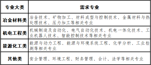招聘主要有冶金工艺、轧钢工艺、产品研发、机械、电气设备管理等岗位,具体专业需求如下: